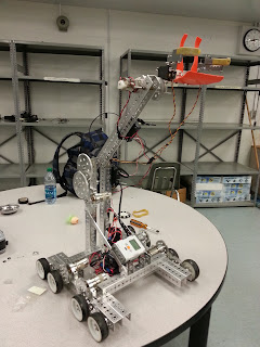 Casey and I stayed afterschool today to practise with the robot and our new arm as we have a practise tournament on Saturday, November 3. This is one of our runs, timed at a two-minute period. After repeated practise we got our best to be 12 rings placed on the middle rack, and developed a strategy to get the most rings in the least amount of time.